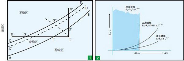 根據(jù)大量試驗的結(jié)果證實,溶液的過飽和與結(jié)晶的關(guān)系可用上圖1表示;圖中的AB 線為普通的溶解度曲線,CD 線代表溶液過飽和而能自發(fā)地產(chǎn)生晶核的濃度曲線( 超溶解度曲線),它與溶解度曲線大致平行。這兩根曲線將濃度——溫度圖分割為三個區(qū)城。在 AB 曲線以下是穩(wěn)定區(qū),在此區(qū)中溶液尚未達(dá)到飽和,因此沒有結(jié)晶的可能。AB 線以上為過飽和溶液區(qū),此區(qū)又分為兩部分:在 AB 與 CD 線之間稱為介穩(wěn)區(qū),在這個區(qū)域中,不會自發(fā)地產(chǎn)生晶核,但如果溶液中已加了晶種, 這些晶種就會長大。 CD 線以上是不穩(wěn)區(qū),在此區(qū)域中,溶液能自發(fā)地產(chǎn)生晶核。若原始濃度為 E 的潔凈溶液在沒有溶劑損失的情況下冷卻到 F 點,溶液剛好達(dá)到飽和,但不能結(jié)晶,因為它還缺乏作推動力的過飽和度。從F 點繼續(xù)冷卻到 G 點的一段期間,溶液經(jīng)過介穩(wěn)區(qū),雖已處于過飽和狀態(tài),但仍不能自發(fā)地產(chǎn)生晶核。只有冷卻到 G點后,溶液中才能自發(fā)地產(chǎn)生晶核,越深入不穩(wěn)區(qū)(例如達(dá)到 H 點),自發(fā)產(chǎn)生的晶核也越多。由此可見,超溶解度曲線及介穩(wěn)區(qū)、不穩(wěn)區(qū)這些概念對于結(jié)晶過程有重要意義。把溶液中的溶劑蒸發(fā)一部分,也能使溶液達(dá)到過飽和狀態(tài),圖中 EF ’ G’線代表此恒溫蒸發(fā)過程。在工業(yè)結(jié)晶中往合并使用冷卻和蒸發(fā),此過程可由 EG’’線代表。